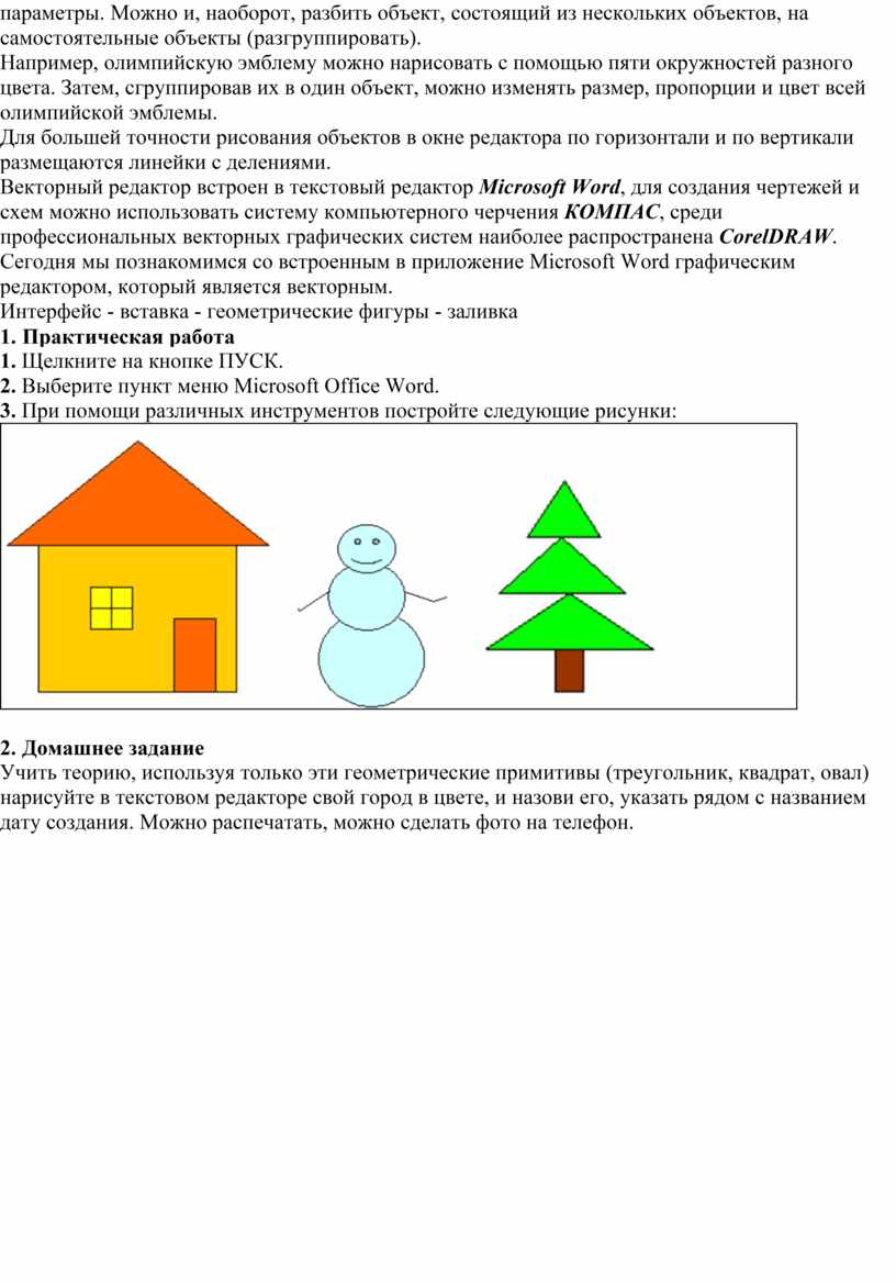 Учить теорию, используя только эти геометрические примитивы (треугольник, квадрат, овал) нарисуйте в текстовом редакторе свой город в цвете, и назови его, указать рядом с названием дату создания. Можно распечатать, можно сделать фото на телефон.
