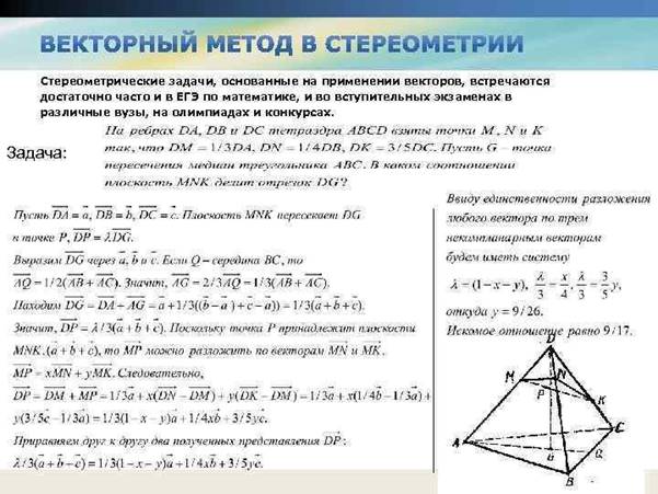 Таким образом, векторно-координатный метод — эффективный и универсальный способ нахождения любых углов или расстояний между стереометрическими объектами в пространстве. При правильном выборе системы координат стереометрические задачи решаются гораздо легче, чем традиционным способом.