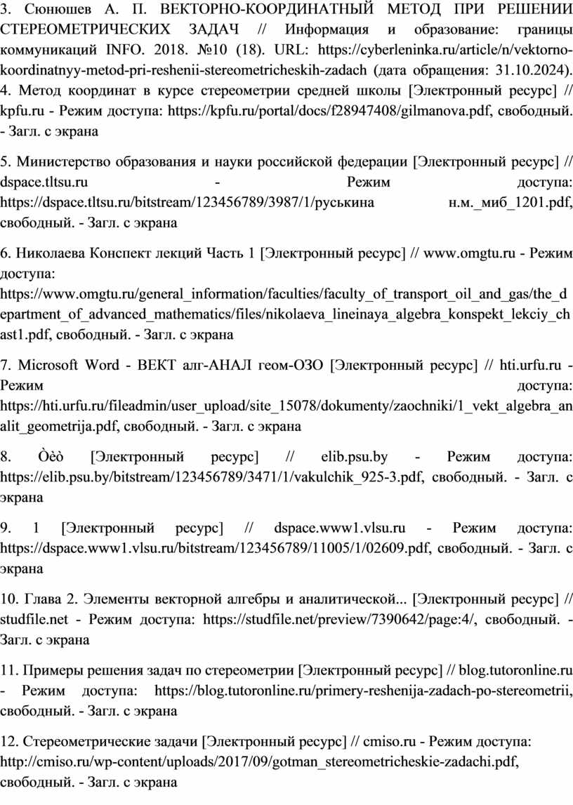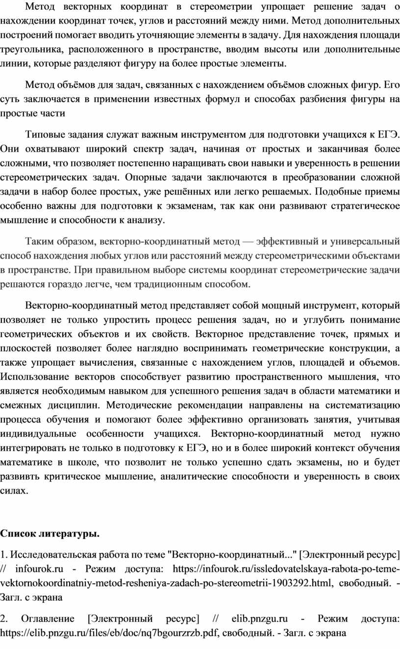 3. Сюнюшев А. П. ВЕКТОРНО-КООРДИНАТНЫЙ МЕТОД ПРИ РЕШЕНИИ СТЕРЕОМЕТРИЧЕСКИХ ЗАДАЧ // Информация и образование: границы коммуникаций INFO. 2018. №10 (18). URL: https://cyberleninka.ru/article/n/vektorno-koordinatnyy-metod-pri-reshenii-stereometricheskih-zadach (дата обращения: 31.10.2024). 4. Метод координат в курсе стереометрии средней школы [Электронный ресурс] // kpfu.ru - Режим доступа: https://kpfu.ru/portal/docs/f28947408/gilmanova.pdf, свободный. - Загл. с экрана