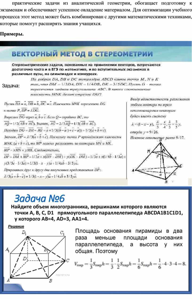 При решении задачи о пересечении двух плоскостей можно использовать уравнения этих плоскостей в виде нормальных векторов и точек, что является достаточно эффективным способом нахождения точек пересечения. Многие стереометрические задачи имеют как чисто геометрическую, так и векторную форму, что предоставляет возможность использовать более удобный подход в зависимости от конкретной задачи и доступных данных. При этом важно практиковаться в решении типовых задач, чтобы выработать навыки оперативного применения полученных знаний. Комплексный подход к обучению, сочетающий теорию векторной алгебры и практические задачи из аналитической геометрии, обогащает подготовку к экзаменам и обеспечивает успешное овладение материалом. Для оптимизации учебного процесса этот метод может быть комбинирован с другими математическими техниками, которые помогут расширять знания учащихся.