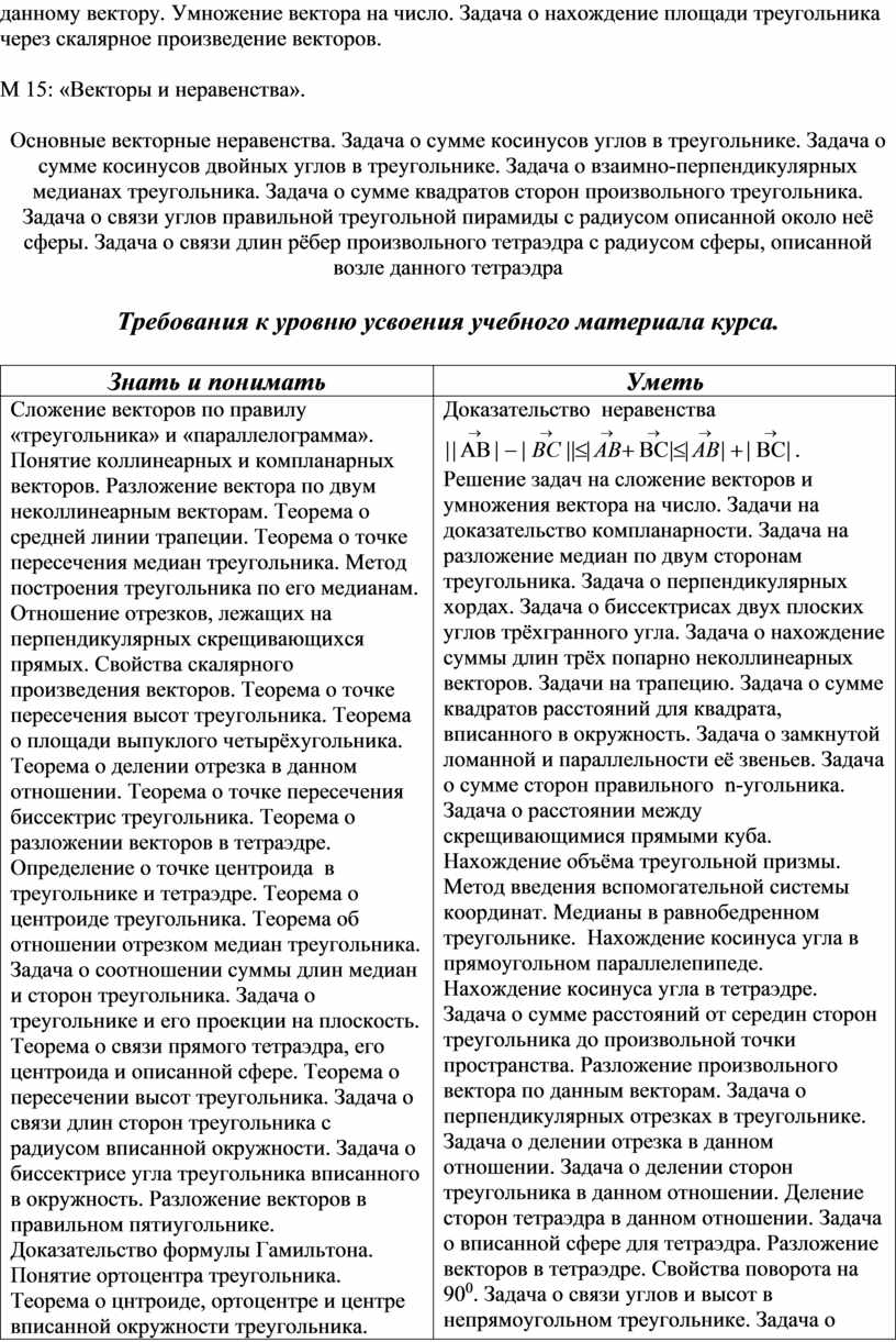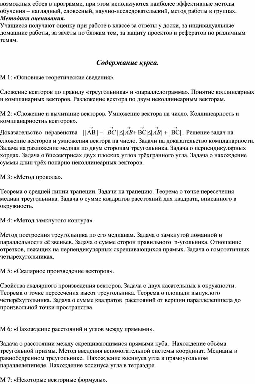 В основе данного курса лежат обязательные результаты обучения по геометрии в модуле изучения векторов. Но вместе с тем, данный модуль получает своё дальнейшее развитие в рамках данного курса. С помощью векторного метода учащиеся учатся решать задачи, которые до сих пор решали методами классической геометрии. Учатся анализировать задачи и применять векторный метод при их решении. При реализации курса учащимися рассматриваются совершенно новые теоремы для векторов, отрабатывается умение их применения при решении задач повышенной сложности. Наличие сложных задач по геометрии из модуля «Вектора» всегда отличало вступительные экзаменационные работы на математические факультеты ведущих ВУЗов страны. Поэтому, умение решать такие задачи, ещё и решение вопроса дальнейшего образования в ВУЗе. Следует отметить, что такие задачи стали предлагаться при проведении ЕГЭ, в группе С.
