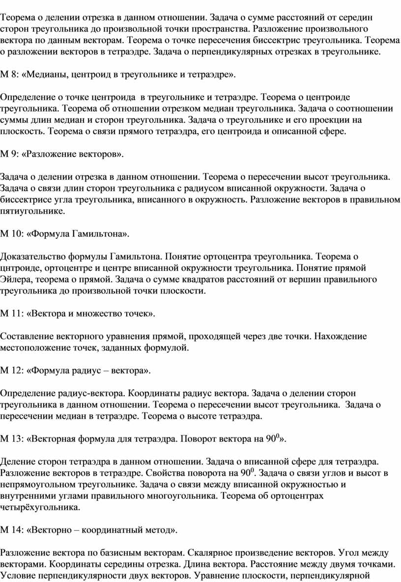 Сложение векторов по правилу «треугольника» и «параллелограмма». Понятие коллинеарных и компланарных векторов. Разложение вектора по двум неколлинеарным векторам. Теорема о средней линии трапеции. Теорема о точке пересечения медиан треугольника. Метод построения треугольника по его медианам. Отношение отрезков, лежащих на перпендикулярных скрещивающихся прямых. Свойства скалярного произведения векторов. Теорема о точке пересечения высот треугольника. Теорема о площади выпуклого четырёхугольника. Теорема о делении отрезка в данном отношении. Теорема о точке пересечения биссектрис треугольника. Теорема о разложении векторов в тетраэдре. Определение о точке центроида в треугольнике и тетраэдре. Теорема о центроиде треугольника. Теорема об отношении отрезком медиан треугольника. Задача о соотношении суммы длин медиан и сторон треугольника. Задача о треугольнике и его проекции на плоскость. Теорема о связи прямого тетраэдра, его центроида и описанной сфере. Теорема о пересечении высот треугольника. Задача о связи длин сторон треугольника с радиусом вписанной окружности. Задача о биссектрисе угла треугольника вписанного в окружность. Разложение векторов в правильном пятиугольнике. Доказательство формулы Гамильтона. Понятие ортоцентра треугольника. Теорема о цнтроиде, ортоцентре и центре вписанной окружности треугольника. Понятие прямой Эйлера, теорема о прямой. Задача о сумме квадратов расстояний от вершин правильного треугольника до произвольной точки плоскости. Определение радиус-вектора. Координаты радиус вектора. Теорема о пересечении высот треугольника. Задача о пересечении медиан в тетраэдре. Теорема о высоте тетраэдра. Разложение вектора по базисным векторам. Скалярное произведение векторов. Угол между векторами. Координаты середины отрезка. Длина вектора. Расстояние между двумя точками. Условие перпендикулярности двух векторов. Уравнение плоскости , перпендикулярной данному вектору. Умножение вектора на число. Задача о нахождение площади треугольника через скалярное произведение векторов. |