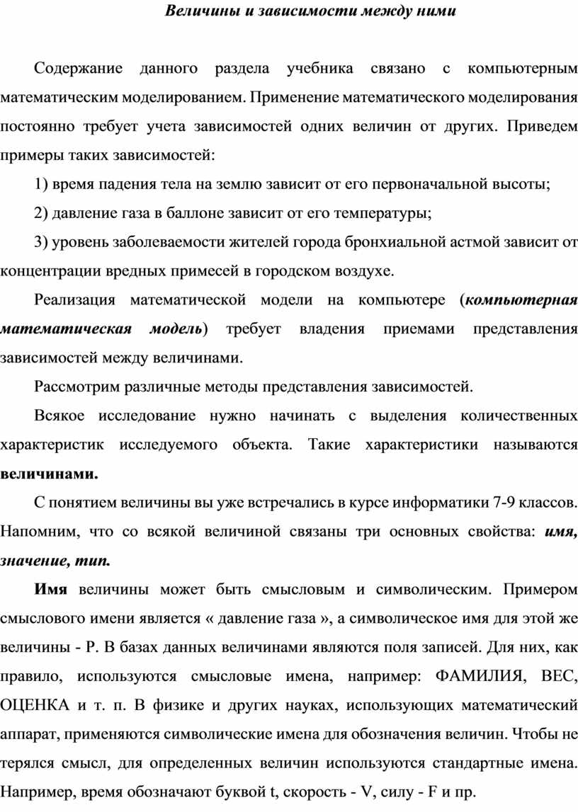 Содержание данного раздела учебника связано с компьютерным математическим моделированием. Применение математического моделирования постоянно требует учета зависимостей одних величин от других. Приведем примеры таких зависимостей: