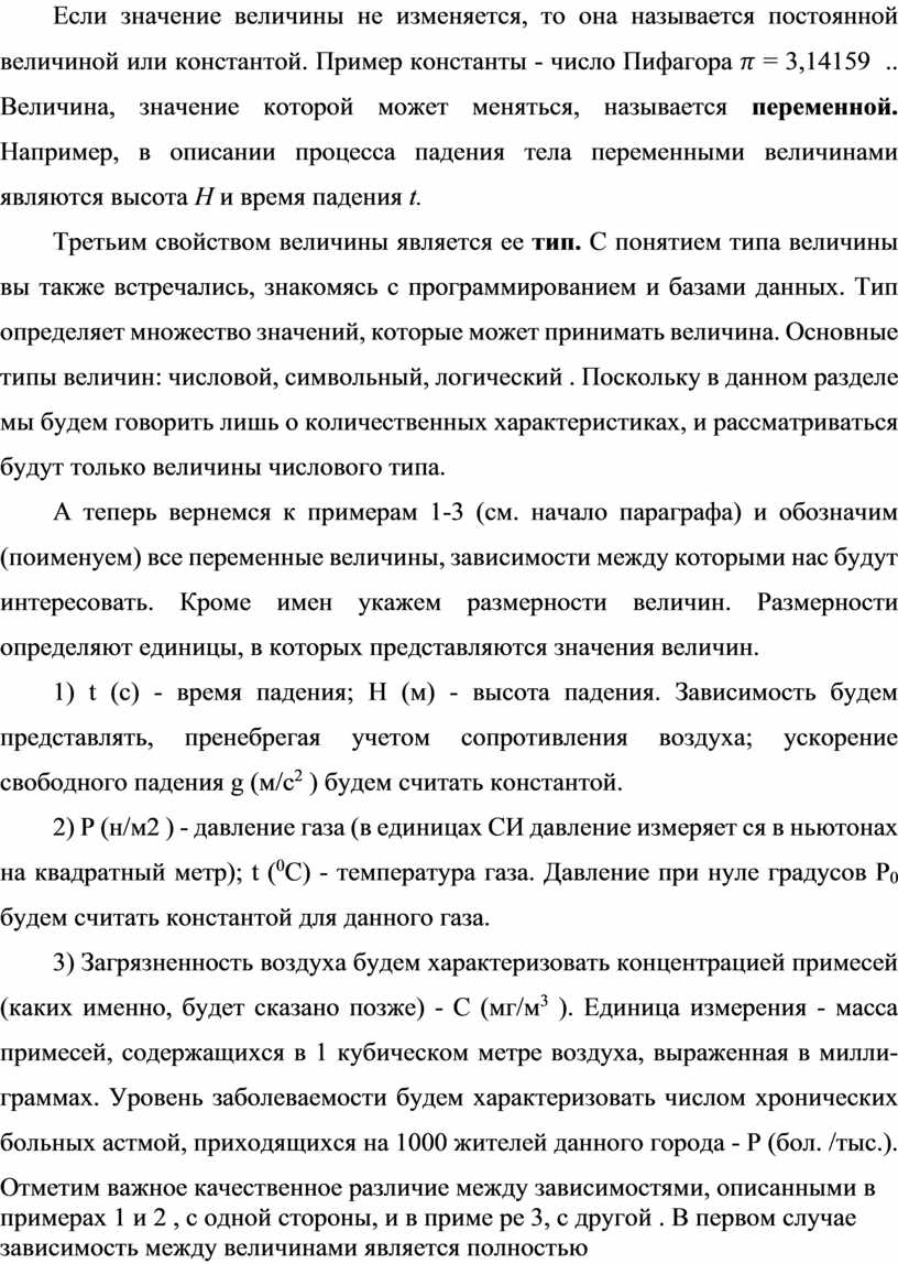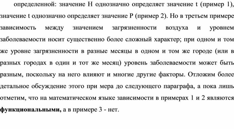 Отметим важное качественное различие между зависимостями, описанными в примерах 1 и 2 , с одной стороны, и в приме ре 3, с другой . В первом случае зависимость между величинами является полностью определенной: значение Н однозначно определяет значение t (пример 1), значение t однозначно определяет значение Р (пример 2). Но в третьем примере зависимость между значением загрязненности воздуха и уровнем заболеваемости носит существенно более сложный характер; при одном и том же уровне загрязненности в разные месяцы в одном и том же городе (или в разных городах в один и тот же месяц) уровень заболеваемости может быть разным, поскольку на него влияют и многие другие факторы. Отложим более детальное обсуждение этого при мера до следующего параграфа, а пока лишь отметим, что на математическом языке зависимости в примерах 1 и 2 являются функциональными, а в примере 3 - нет.