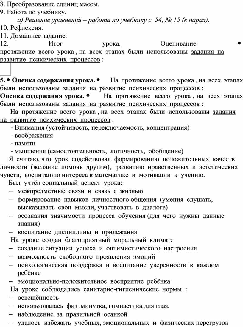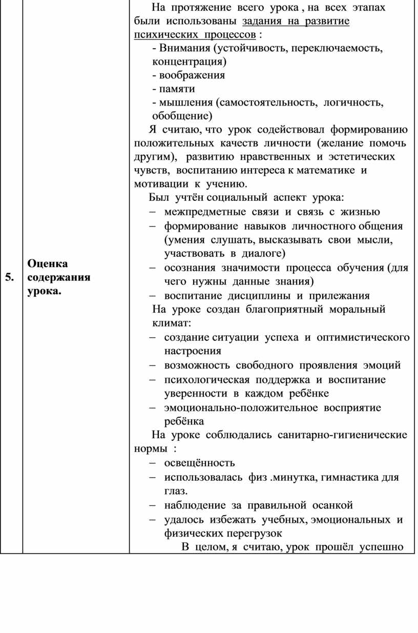На протяжение всего урока , на всех этапах были использованы задания на развитие психических процессов : - Внимания (устойчивость, переключаемость, концентрация) - воображения - памяти - мышления (самостоятельность, логичность, обобщение) Я считаю, что урок содействовал формированию положительных качеств личности (желание помочь другим), развитию нравственных и эстетических чувств, воспитанию интереса к математике и мотивации к учению. Был учтён социальный аспект урока: - межпредметные связи и связь с жизнью - формирование навыков личностного общения (умения слушать, высказывать свои мысли, участвовать в диалоге) - осознания значимости процесса обучения (для чего нужны данные знания) - воспитание дисциплины и прилежания На уроке создан благоприятный моральный климат: - создание ситуации успеха и оптимистического настроения - возможность свободного проявления эмоций - психологическая поддержка и воспитание уверенности в каждом ребёнке - эмоционально-положительное восприятие ребёнка На уроке соблюдались санитарно-гигиенические нормы : - освещённость - использовалась физ .минутка, гимнастика для глаз. - наблюдение за правильной осанкой - удалось избежать учебных, эмоциональных и физических перегрузок В целом, я считаю, урок прошёл успешно |