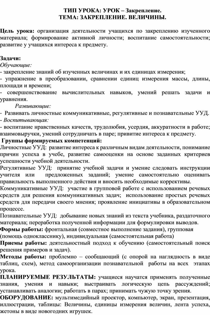 по теме: Закрепление. Величины