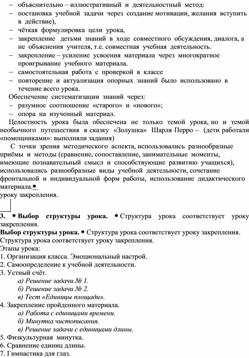 Структура урока соответствует уроку закрепления. Этапы урока: 1. Организация класса. Эмоциональный настрой. 2. Самоопределение к учебной деятельности. 3. Устный счёт. а) Решение задачи № 1. б) Решение задачи № 2. в) Тест «Единицы площади». 4. Закрепление пройденного материала. а) Работа с единицами времени. б) Минутка чистописания. в) Решение задачи с единицами длины. 5. Физкультурная минутка. 6. Сравнение единиц длины. 7. Гимнастика для глаз. 8. Преобразование единиц массы. 9. Работа по учебнику. а) Решение уравнений – работа по учебнику с. 54, № 15 (в парах). 10. Рефлексия. 11. Домашнее задание. 12. Итог урока. Оценивание. |