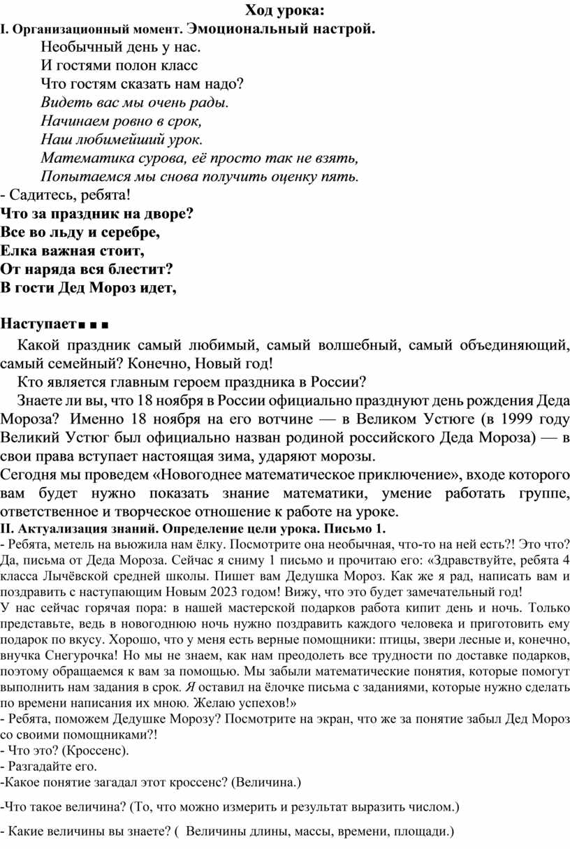 У нас сейчас горячая пора: в нашей мастерской подарков работа кипит день и ночь. Только представьте, ведь в новогоднюю ночь нужно поздравить каждого человека и приготовить ему подарок по вкусу. Хорошо, что у меня есть верные помощники: птицы, звери лесные и, конечно, внучка Снегурочка! Но мы не знаем, как нам преодолеть все трудности по доставке подарков, поэтому обращаемся к вам за помощью. Мы забыли математические понятия, которые помогут выполнить нам задания в срок. Я оставил на ёлочке письма с заданиями, которые нужно сделать по времени написания их мною. Желаю успехов!»