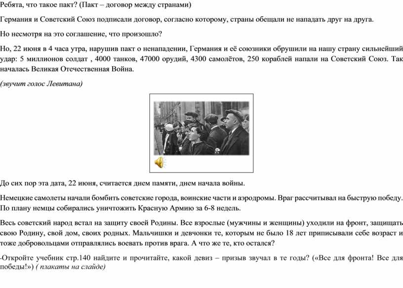 Между Германией и Советским Союзом был подписан пакт о ненападении, Ребята, что такое пакт? (Пакт – договор между странами) Германия и Советский Союз подписали договор, согласно которому, страны обещали не нападать друг на друга. Но несмотря на это соглашение, что произошло? Но, 22 июня в 4 часа утра, нарушив пакт о ненападении, Германия и её союзники обрушили на нашу страну сильнейший удар: 5 миллионов солдат , 4000 танков, 47000 орудий, 4300 самолётов, 250 кораблей напали на Советский Союз. Так началась Великая Отечественная Война. (звучит голос Левитана)
