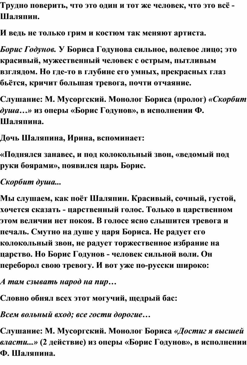 Слушание: М. Мусоргский. Монолог Бориса (пролог) «Скорбит душа…» из оперы «Борис Годунов», в исполнении Ф. Шаляпина.