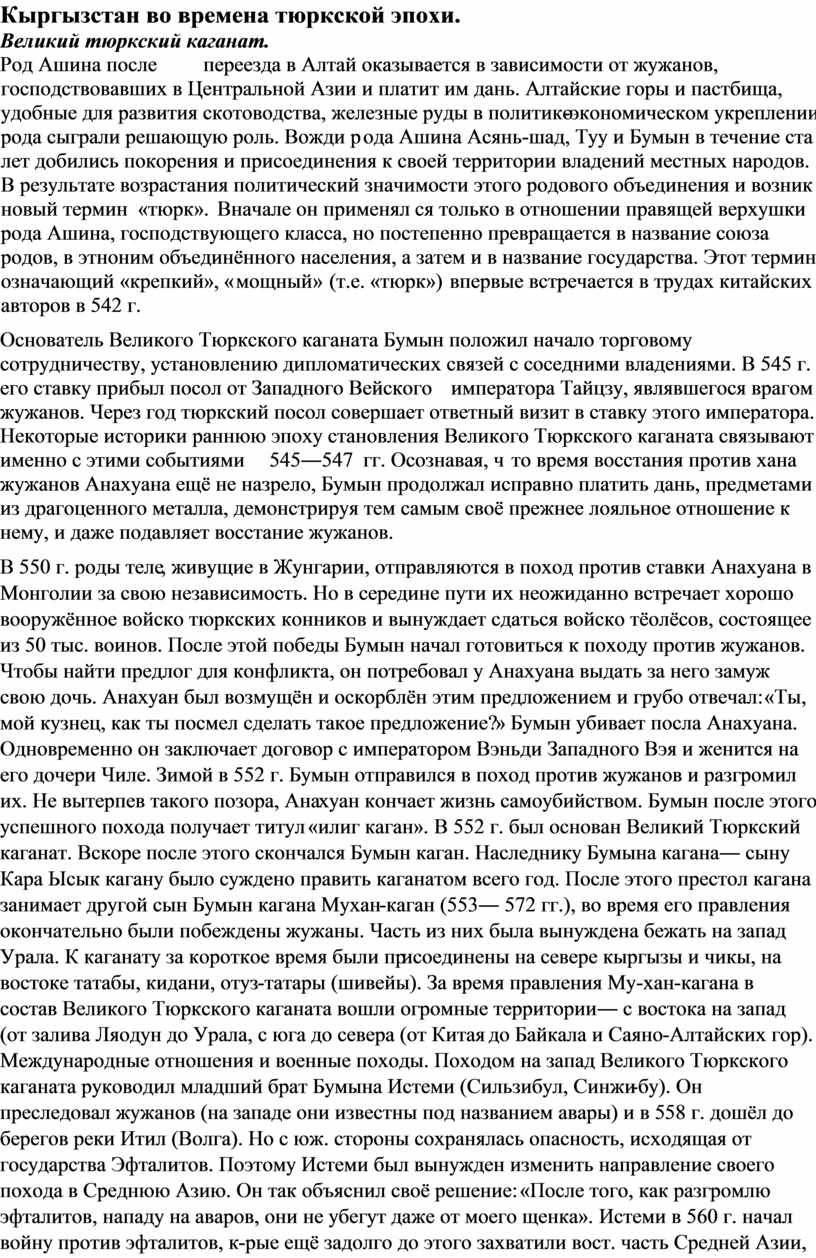 В 550 г. роды теле, живущие в Жунгарии, отправляются в поход против ставки Анахуана в Монголии за свою независимость. Но в середине пути их неожиданно встречает хорошо вооружённое войско тюркских конников и вынуждает сдаться войско тёолёсов, состоящее из 50 тыс. воинов. После этой победы Бумын начал готовиться к походу против жужанов. Чтобы найти предлог для конфликта, он потребовал у Анахуана выдать за него замуж свою дочь. Анахуан был возмущён и оскорблён этим предложением и грубо отвечал: «Ты, мой кузнец, как ты посмел сделать такое предложение?» Бумын убивает посла Анахуана. Одновременно он заключает договор с императором Вэньди Западного Вэя и женится на его дочери Чиле. Зимой в 552 г. Бумын отправился в поход против жужанов и разгромил их. Не вытерпев такого позора, Анахуан кончает жизнь самоубийством. Бумын после этого успешного похода получает титул «илиг каган». В 552 г. был основан Великий Тюркский каганат. Вскоре после этого скончался Бумын каган. Наследнику Бумына кагана ― сыну Кара Ысык кагану было суждено править каганатом всего год. После этого престол кагана занимает другой сын Бумын кагана Мухан-каган (553― 572 гг.), во время его правления окончательно были побеждены жужаны. Часть из них была вынуждена бежать на запад Урала. К каганату за короткое время были присоединены на севере кыргызы и чикы, на востоке татабы, кидани, отуз-татары (шивейы). За время правления Му-хан-кагана в состав Великого Тюркского каганата вошли огромные территории ― с востока на запад (от залива Ляодун до Урала, с юга до севера (от Китая до Байкала и Саяно-Алтайских гор). Международные отношения и военные походы. Походом на запад Великого Тюркского каганата руководил младший брат Бумына Истеми (Сильзибул, Синжи-бу). Он преследовал жужанов (на западе они известны под названием авары) и в 558 г. дошёл до берегов реки Итил (Волга). Но с юж. стороны сохранялась опасность, исходящая от государства Эфталитов. Поэтому Истеми был вынужден изменить направление своего похода в Среднюю Азию. Он так объяснил своё решение: «После того, как разгромлю эфталитов, нападу на аваров, они не убегут даже от моего щенка». Истеми в 560 г. начал войну против эфталитов, к-рые ещё задолго до этого захватили вост. часть Средней Азии, присоединив эти владения к своей территории. Истеми выдаёт замуж свою дочь за иранского шаха Хосрова I Ану-ширвану и заключает с ним союз против эфталитов. Между этими государствами устанавливается непрерывная дипломатическая связь. По сведениям Фирдоуси, тюркские послы, идущие в Иран были захвачены по пути в плен эфталитами и по приказанию эфталитского царя Гатифара преданы смерти. После этого события Истеми собирает в один кулак всю мощь и, захватив Ташкентский оазис, Чирчикский регион, через Маймург вплотную приближается к Зерафшанской долине. В это время царь Гатифар свою основную силу держал около Бухары. Между этими двумя силами развязалась война, продолжавшаяся восемь дней и эфталиты были побеждены. В это же время шах Хосров тоже напал на эфталитов и захватил многие их территории. Между тюрками и Ираном был составлен договор, согласно к-рому народы, населяющие сев. сторону Аму-Дарьи должны были платить дань Истеми. Но прошло немного времени, и между двумя союзниками началась непримиримая вражда. Причиной этой вражды стал отказ иранского шаха Хо