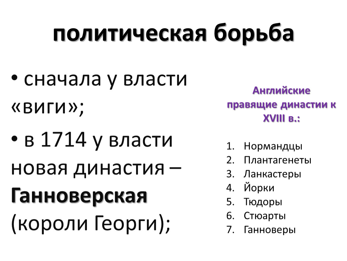 в 1714 у власти новая династия – Ганноверская (короли Георги);