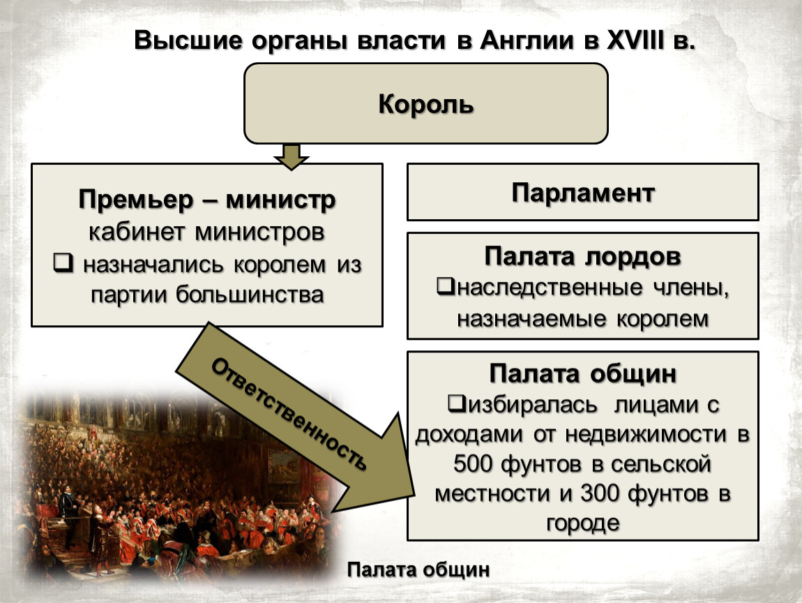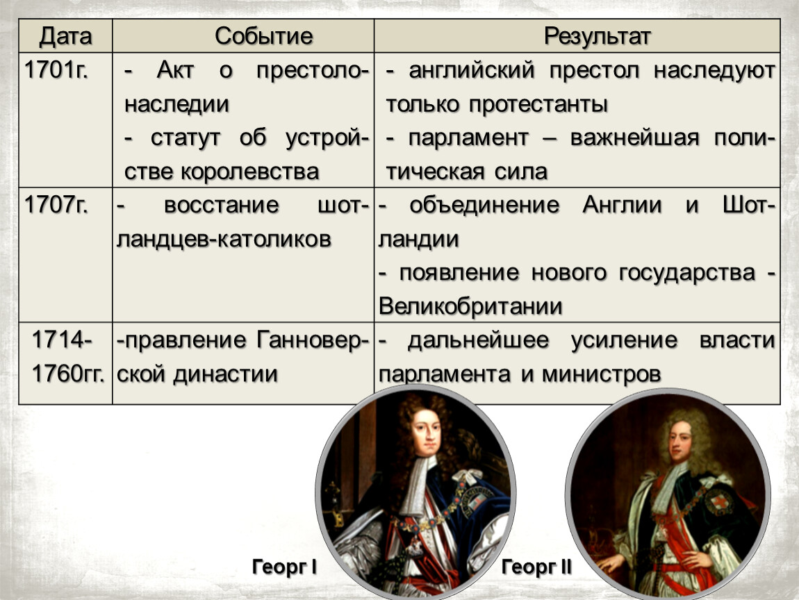 1714- 1760гг. | правление Ганновер-ской династии | - дальнейшее усиление власти парламента и министров |