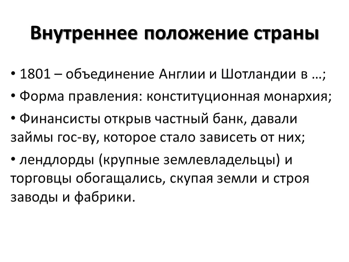 1707г. | - восстание шот-ландцев-католиков | - объединение Англии и Шот-ландии |