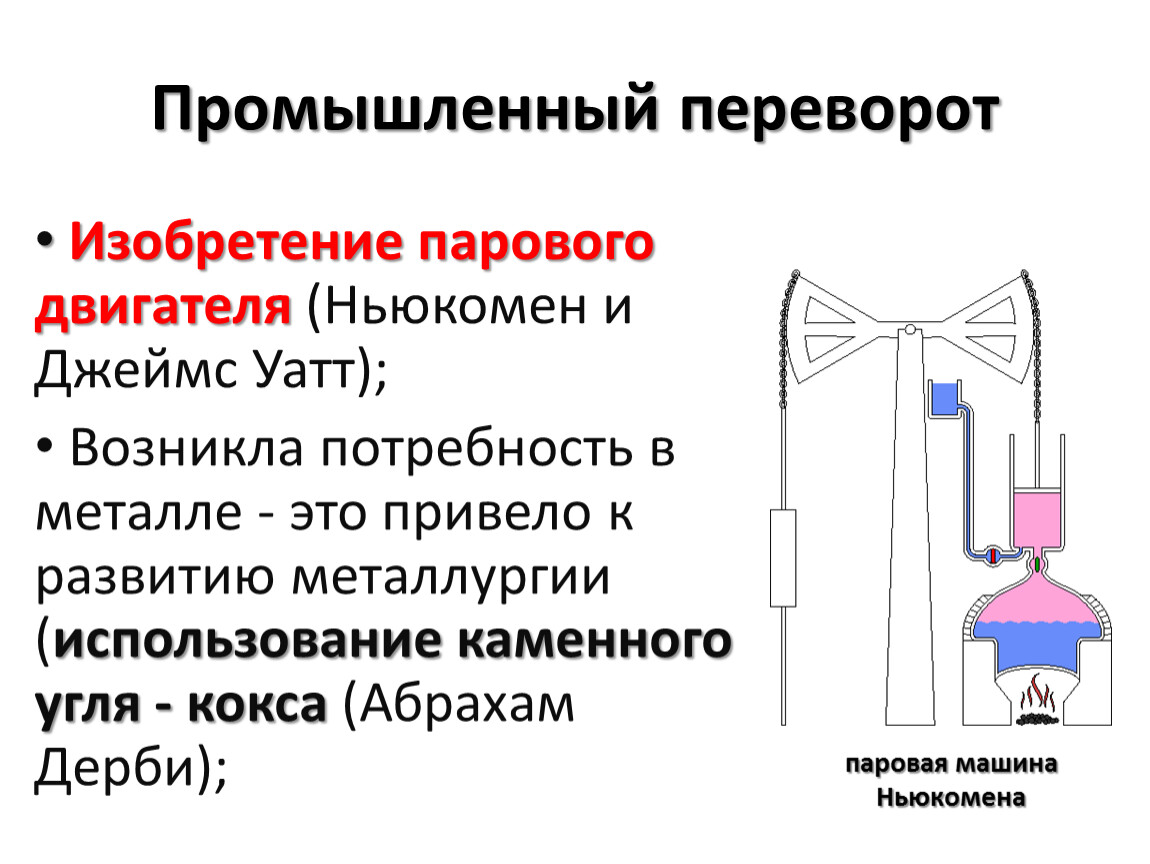 Изобретение парового двигателя (Ньюкомен и Джеймс Уатт);