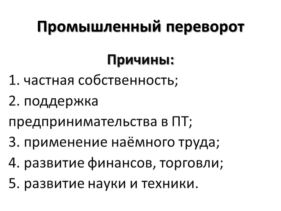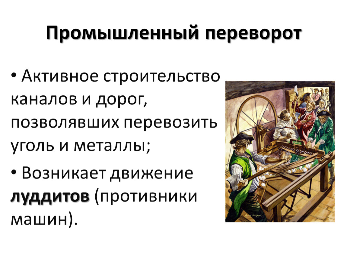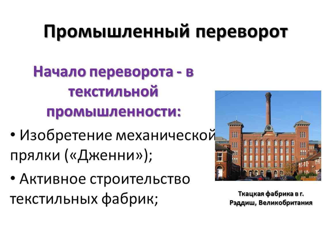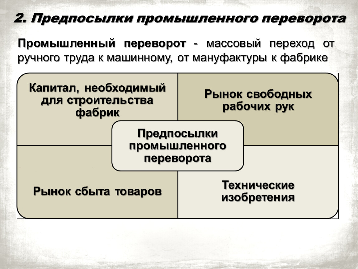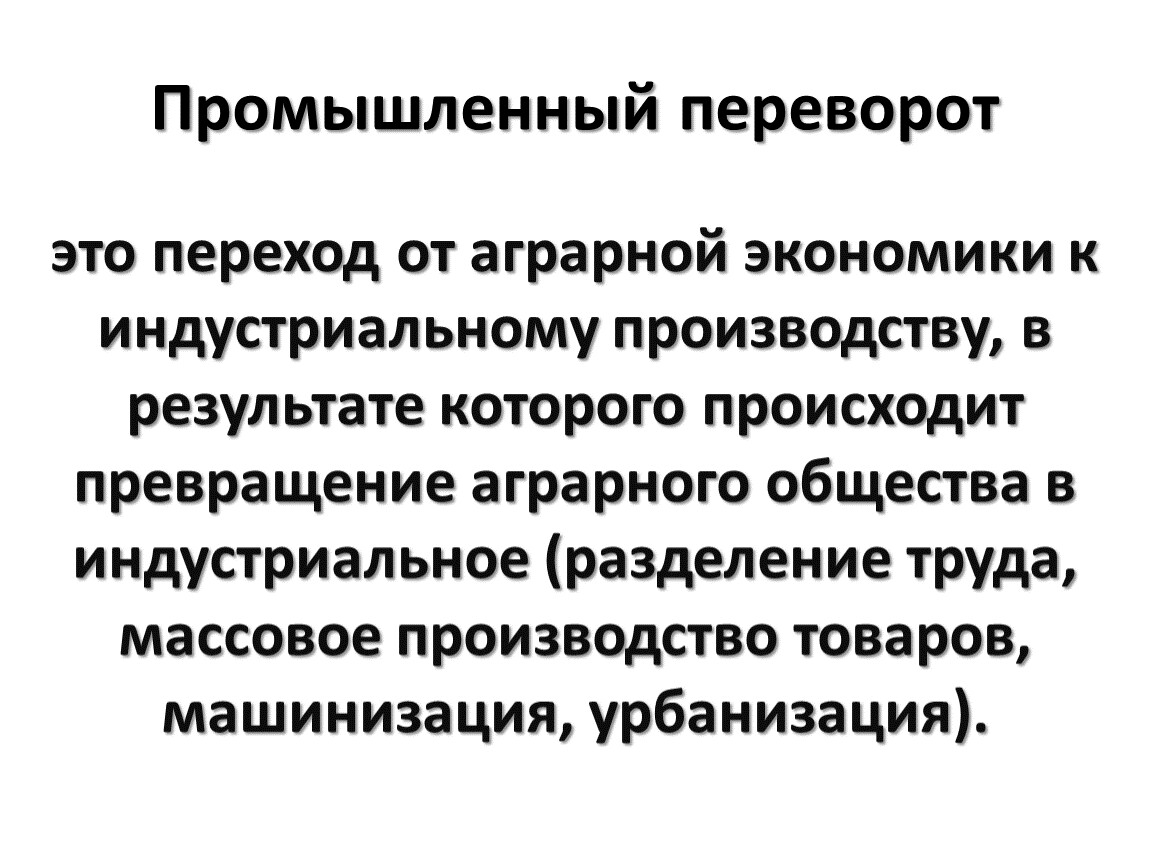Промышленный переворот - массовый переход от ручного труда к машинному, от мануфактуры к фабрике