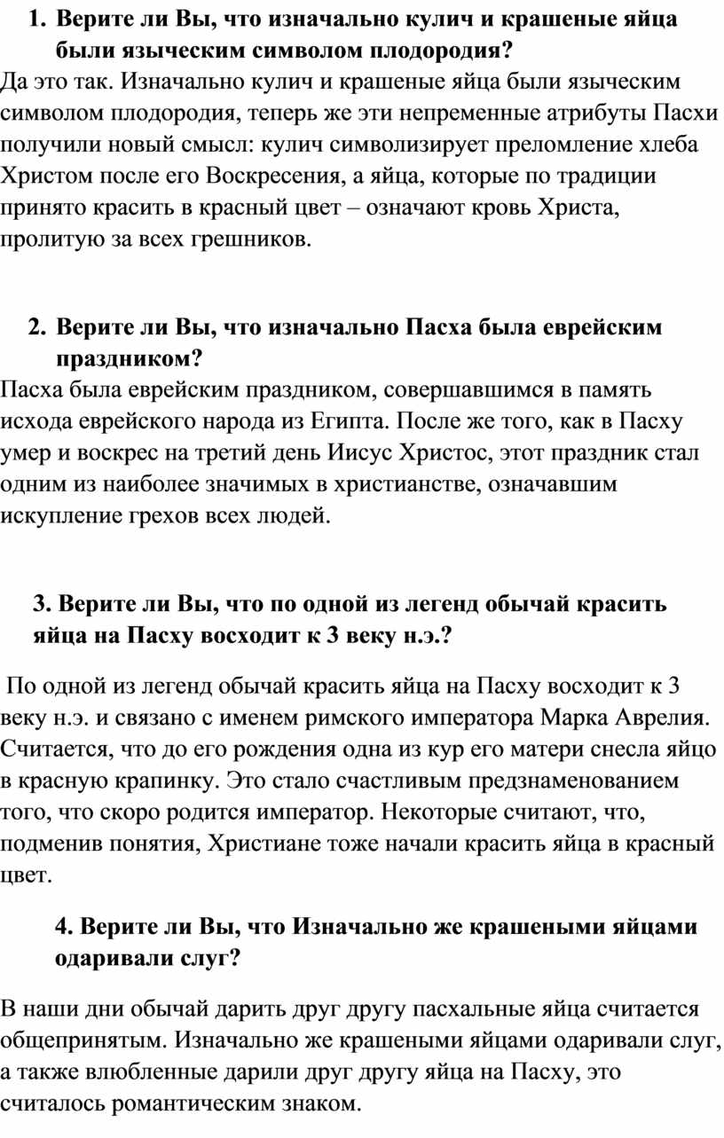 1. Верите ли Вы, что изначально кулич и крашеные яйца были языческим символом плодородия?