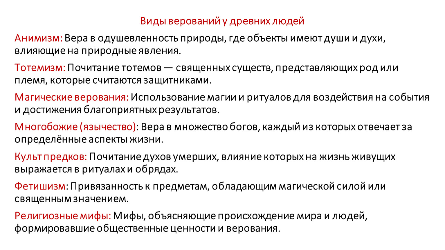 Понятие анимизма подразумевает одушевление предметов и природных стихий, а многобожие (язычество) основывалось на поклонении нескольким богам.