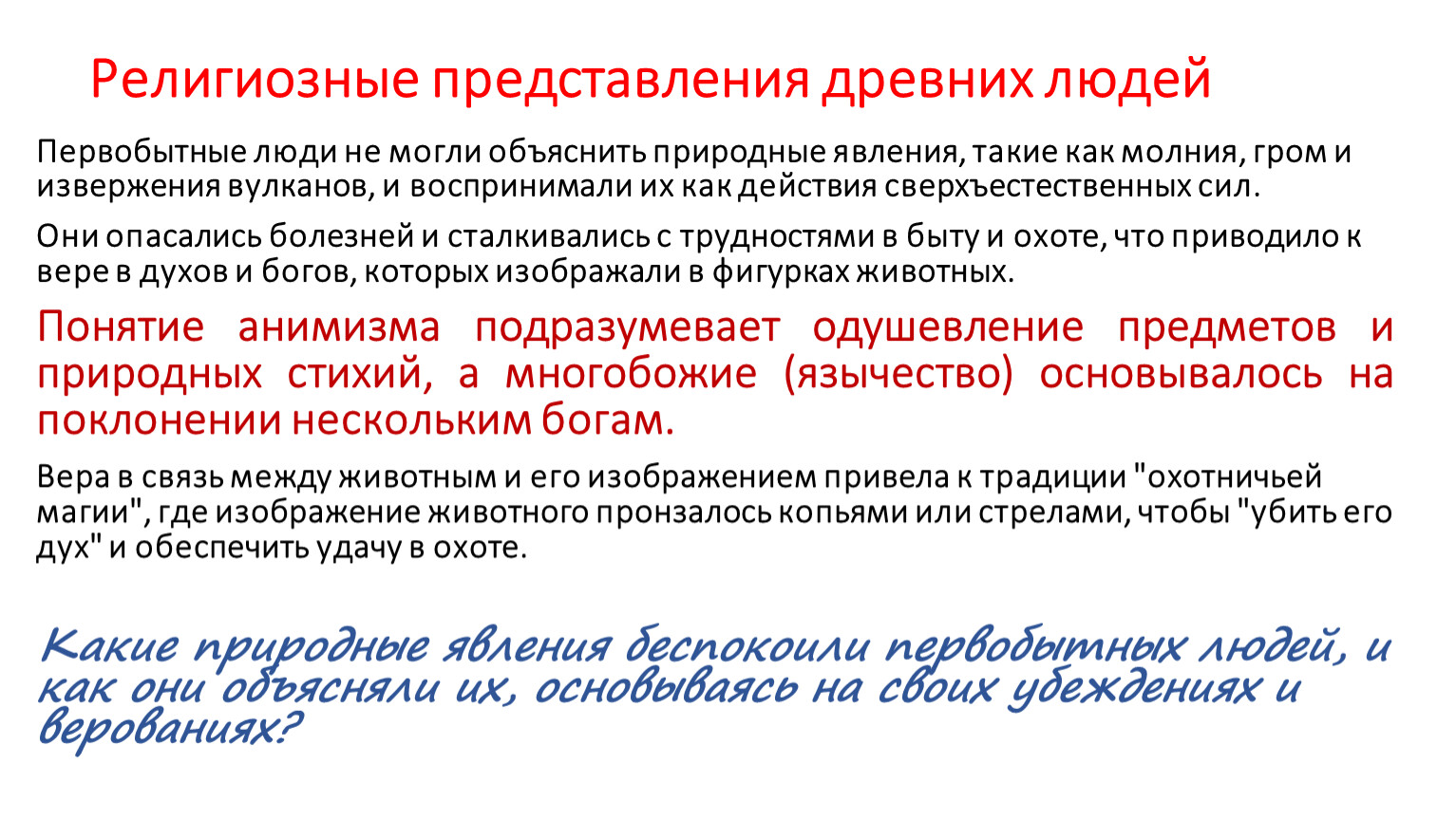 Связь с искусством: Первобытное искусство возникло как попытка повлиять на природные явления и было связано с религиозными представлениями и ритуалами, отражая осознание смертности и веру в существование души.