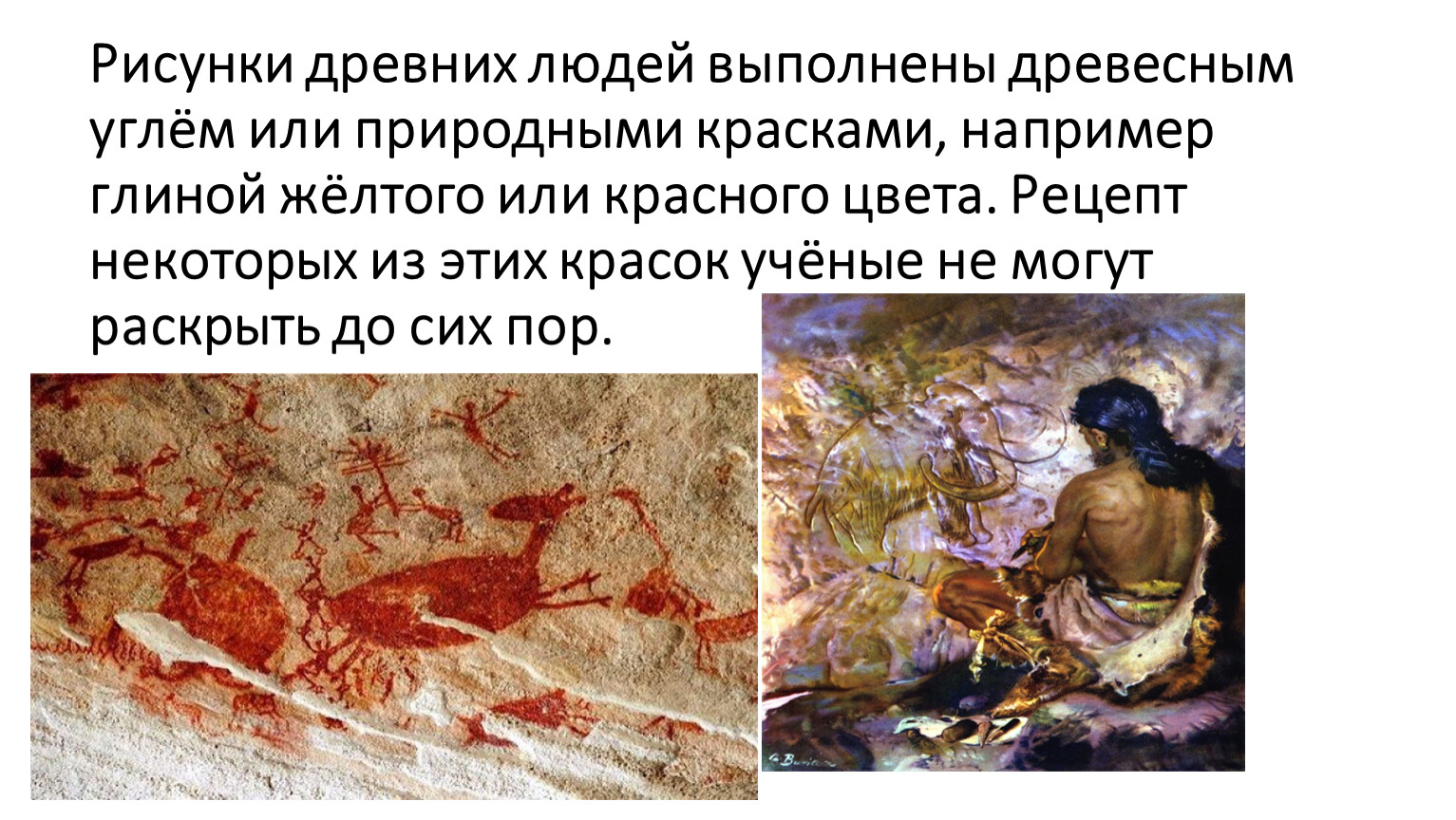 Рисунки древних людей выполнены древесным углём или природными красками, например глиной жёлтого или красного цвета. Рецепт некоторых из этих красок учёные не могут раскрыть до сих пор.