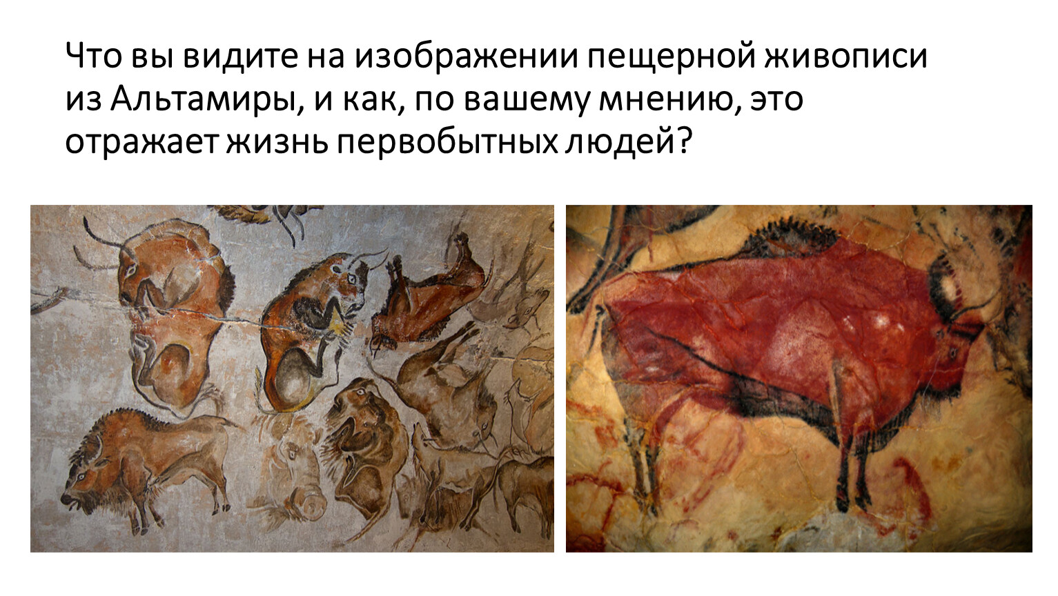 Что вы видите на изображении пещерной живописи из Альтамиры, и как, по вашему мнению, это отражает жизнь первобытных людей?