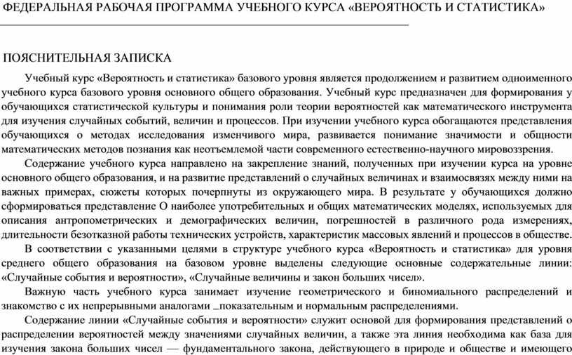Учебный курс «Вероятность и статистика» базового уровня является продолжением и развитием одноименного учебного курса базового уровня основного общего образования. Учебный курс предназначен для формирования у обучающихся статистической культуры и понимания роли теории вероятностей как математического инструмента для изучения случайных событий, величин и процессов. При изучении учебного курса обогащаются представления обучающихся о методах исследования изменчивого мира, развивается понимание значимости и общности математических методов познания как неотъемлемой части современного естественно-научного мировоззрения.