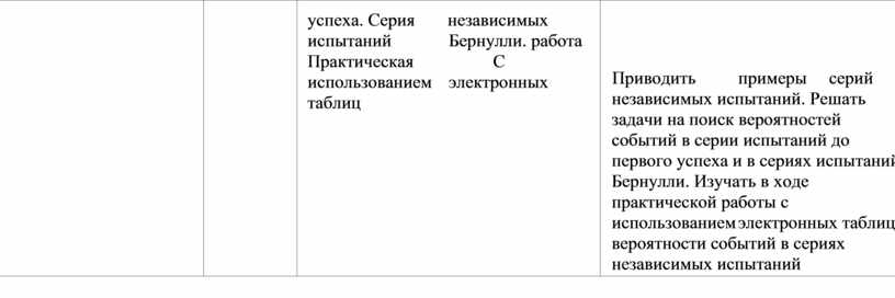 Приводить примеры серий независимых испытаний. Решать задачи на поиск вероятностей событий в серии испытаний до первого успеха и в сериях испытаний Бернулли. Изучать в ходе практической работы с использованием электронных таблиц вероятности событий в сериях независимых испытаний |