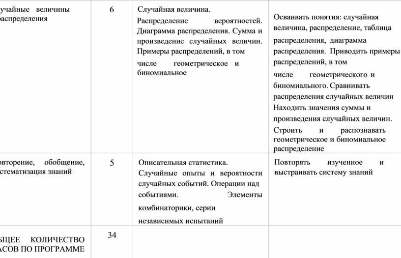 Осваивать понятия: случайная величина, распределение, таблица распределения, диаграмма распределения. Приводить примеры распределений, в том числе геометрического и биномиального. Сравнивать распределения случайных величин Находить значения суммы и произведения случайных величин. Строить и распознавать геометрическое и биномиальное распределение |