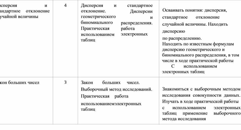 Осваивать понятия: дисперсия, стандартное отклонение случайной величины. Находить дисперсию по распределению. Находить по известным формулам дисперсию геометрического и биномиального распределения, в том числе в ходе практической работы С использованием электронных таблиц |