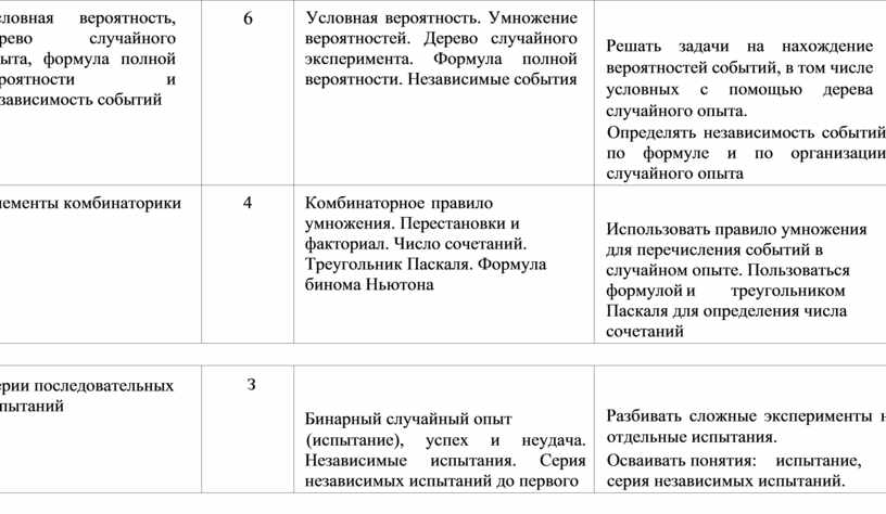 Использовать правило умножения для перечисления событий в случайном опыте. Пользоваться формулой и треугольником Паскаля для определения числа сочетаний |