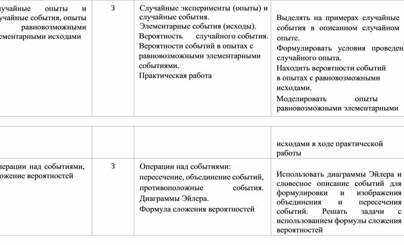 читать и строить таблицы и диаграммы; оперировать понятиями: среднее арифметическое, медиана, наибольшее, наименьшее значение, размах массива числовых данных; оперировать понятиями: случайный эксперимент (опыт) и случайное событие, элементарное событие (элементарный исход) случайного опыта, находить вероятности в опытах с равновозможными случайными событиями, находить и сравнивать вероятности событий в изученных случайных экспериментах; находить и формулировать события: пересечение и объединение данных событий, событие, противоположное данному событию, пользоваться диаграммами Эйлера и формулой сложения вероятностей при решении задач; оперировать понятиями: условная вероятность, независимые события, находить вероятности с помощью правила умножения, с помощью дерева случайного опыта; применять комбинаторное правило умножения при решении задач; оперировать понятиями: испытание, независимые испытания, серия испытаний, успех и неудача, находить вероятности событий в серии независимых испытаний до первого успеха, находить вероятности событий в серии испытаний Бернулли; оперировать понятиями: случайная величина, распределение вероятностей, диаграмма распределения.