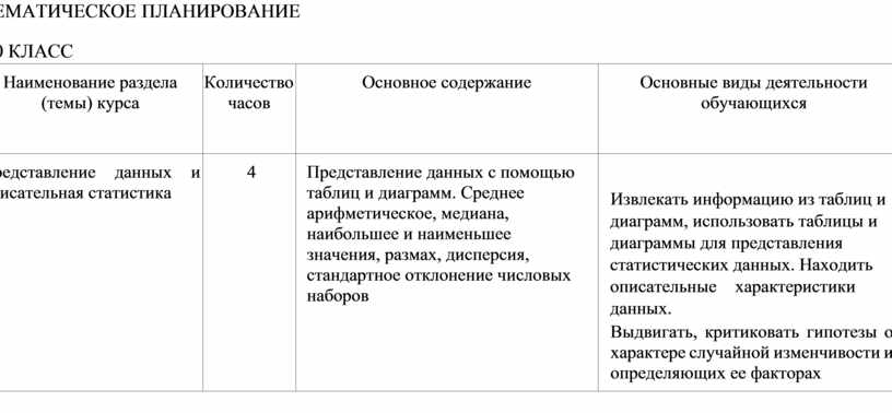 Представление данных с помощью таблиц и диаграмм. Среднее арифметическое, медиана, наибольшее и наименьшее значения, размах, дисперсия и стандартное отклонение числовых наборов.