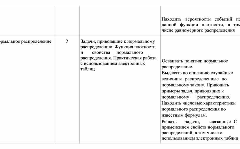 Задачи, приводящие к нормальному распределению. Функция плотности и свойства нормального распределения. Практическая работа с использованием электронных таблиц |