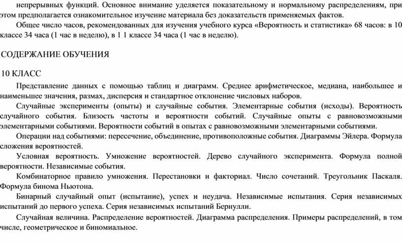 Содержание учебного курса направлено на закрепление знаний, полученных при изучении курса на уровне основного общего образования, и на развитие представлений о случайных величинах и взаимосвязях между ними на важных примерах, сюжеты которых почерпнуты из окружающего мира. В результате у обучающихся должно сформироваться представление О наиболее употребительных и общих математических моделях, используемых для описания антропометрических и демографических величин, погрешностей в различного рода измерениях, длительности безотказной работы технических устройств, характеристик массовых явлений и процессов в обществе.