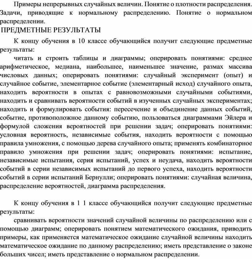 Темы, связанные с непрерывными случайными величинами, акцентируют внимание обучающихся на описании и изучении случайных явлений с помощью непрерывных функций. Основное внимание уделяется показательному и нормальному распределениям, при этом предполагается ознакомительное изучение материала без доказательств применяемых фактов.