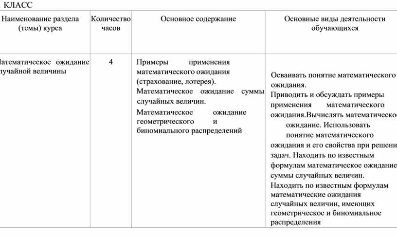 В соответствии с указанными целями в структуре учебного курса «Вероятность и статистика» для уровня среднего общего образования на базовом уровне выделены следующие основные содержательные линии: «Случайные события и вероятности», «Случайные величины и закон больших чисел».