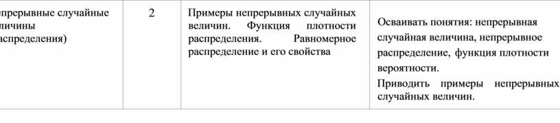 Осваивать понятия: непрерывная случайная величина, непрерывное распределение, функция плотности вероятности. Приводить примеры непрерывных случайных величин. |