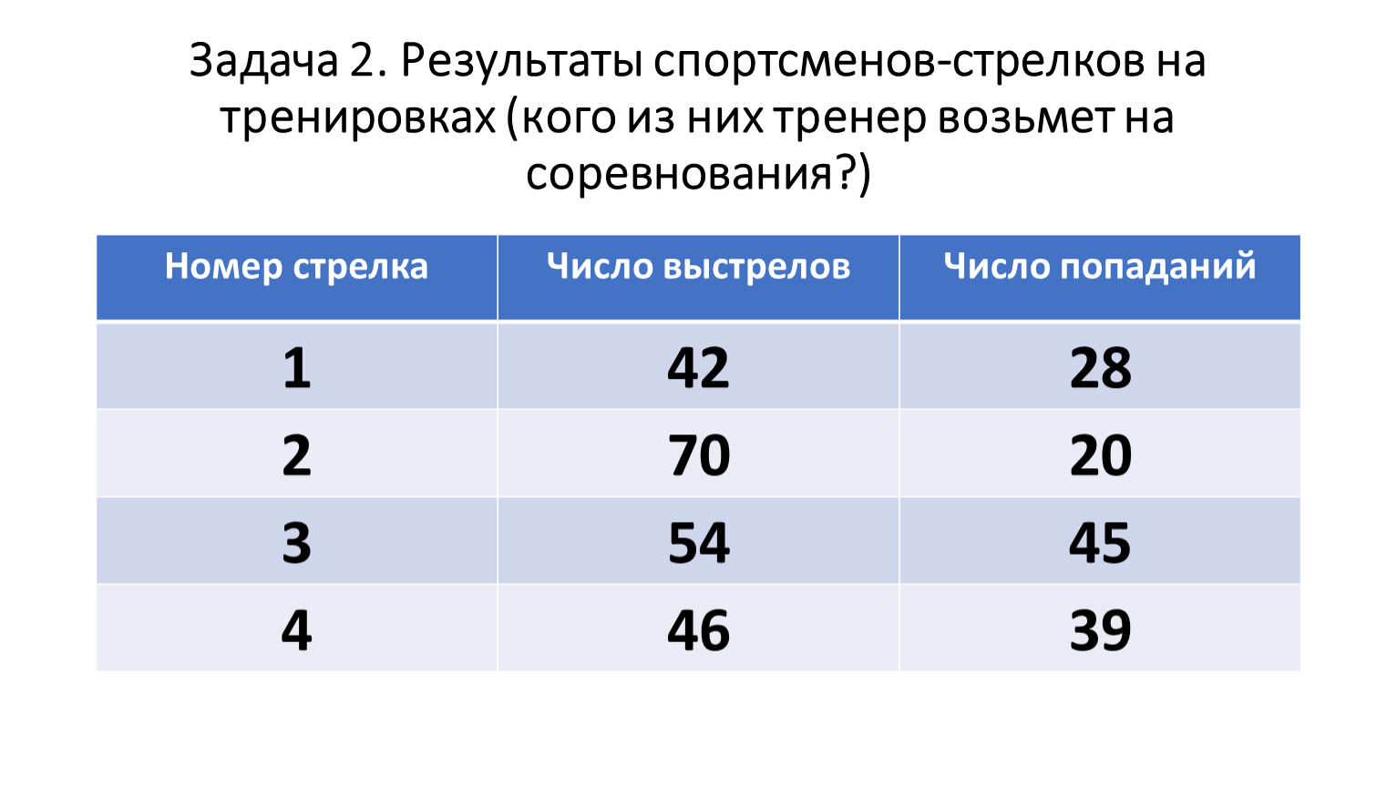 Задача 2. Результаты спортсменов-стрелков на тренировках (кого из них тренер возьмет на соревнования?)