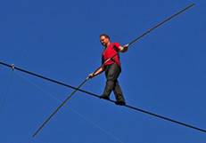 Канатоходец идет по канату. К чему приложен вес его тела? |