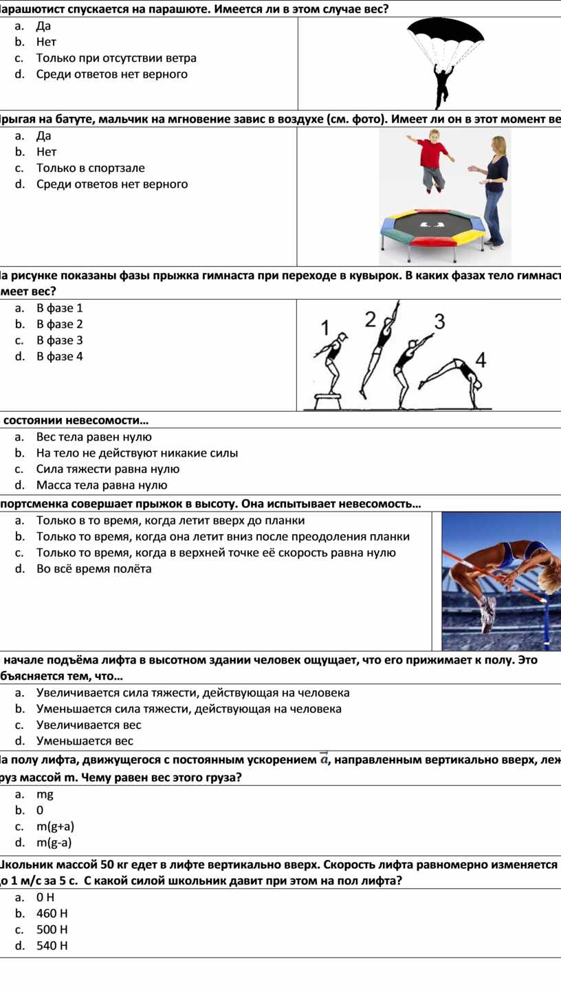 Спортсменка совершает прыжок в высоту. Она испытывает невесомость… |