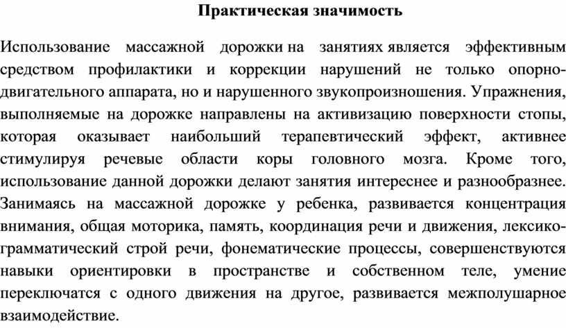 Использование массажной дорожки на занятиях является эффективным средством профилактики и коррекции нарушений не только опорно-двигательного аппарата, но и нарушенного звукопроизношения. Упражнения, выполняемые на дорожке направлены на активизацию поверхности стопы, которая оказывает наибольший терапевтический эффект, активнее стимулируя речевые области коры головного мозга. Кроме того, использование данной дорожки делают занятия интереснее и разнообразнее. Занимаясь на массажной дорожке у ребенка, развивается концентрация внимания, общая моторика, память, координация речи и движения, лексико-грамматический строй речи, фонематические процессы, совершенствуются навыки ориентировки в пространстве и собственном теле, умение переключатся с одного движения на другое, развивается межполушарное взаимодействие.