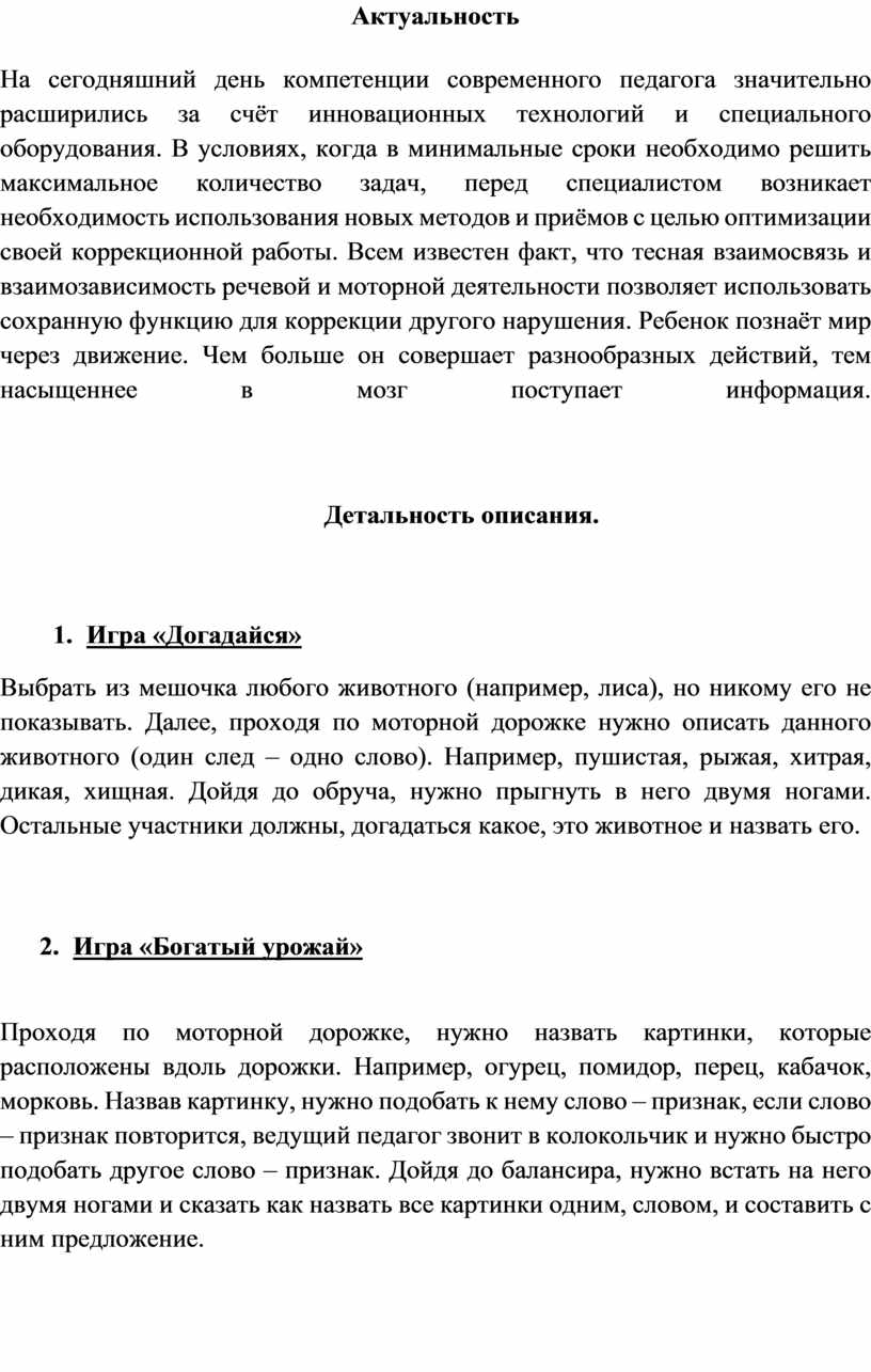 Проходя по моторной дорожке, нужно назвать картинки, которые расположены вдоль дорожки. Например, огурец, помидор, перец, кабачок, морковь. Назвав картинку, нужно подобать к нему слово – признак, если слово – признак повторится, ведущий педагог звонит в колокольчик и нужно быстро подобать другое слово – признак. Дойдя до балансира, нужно встать на него двумя ногами и сказать как назвать все картинки одним, словом, и составить с ним предложение.