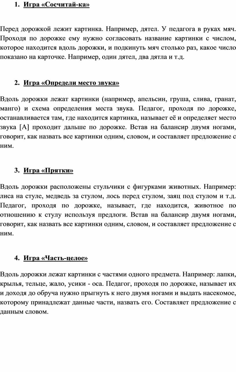 Перед дорожкой лежит картинка. Например, дятел. У педагога в руках мяч. Проходя по дорожке ему нужно согласовать название картинки с числом, которое находится вдоль дорожки, и подкинуть мяч столько раз, какое число показано на карточке. Например, один дятел, два дятла и т.д.