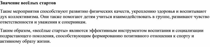 Таким образом, «весёлые старты» являются эффективным инструментом воспитания и социализации подрастающего поколения, способствующим формированию позитивного отношения к спорту и активному образу жизни.