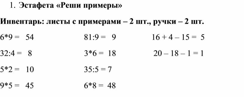 Инвентарь: листы с примерами – 2 шт., ручки – 2 шт.