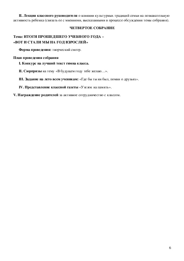 V. Награждение родителей за активное сотрудничество с классом.