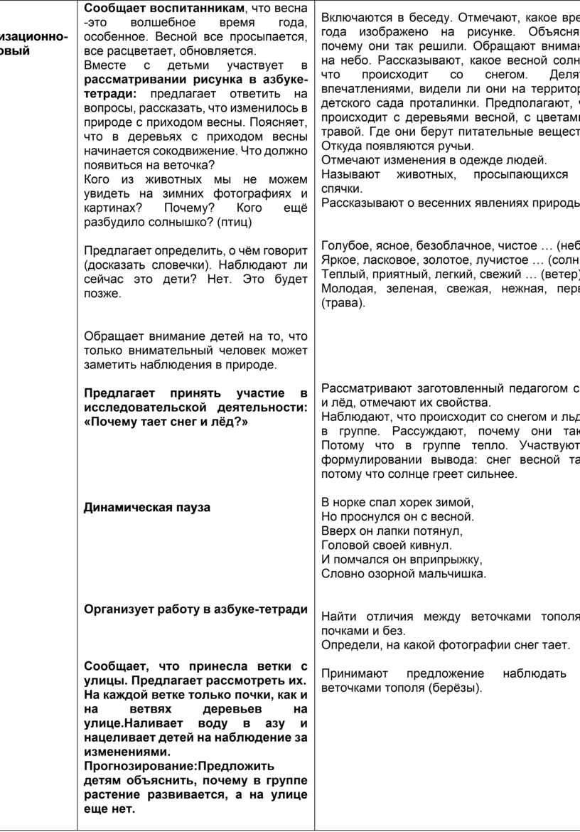 Сообщает воспитанникам, что весна -это волшебное время года, особенное. Весной все просыпается, все расцветает, обновляется. Вместе с детьми участвует в рассматривании рисунка в азбуке-тетради: предлагает ответить на вопросы, рассказать, что изменилось в природе с приходом весны. Поясняет, что в деревьях с приходом весны начинается сокодвижение. Что должно появиться на веточка? Кого из животных мы не можем увидеть на зимних фотографиях и картинах? Почему? Кого ещё разбудило солнышко? (птиц)