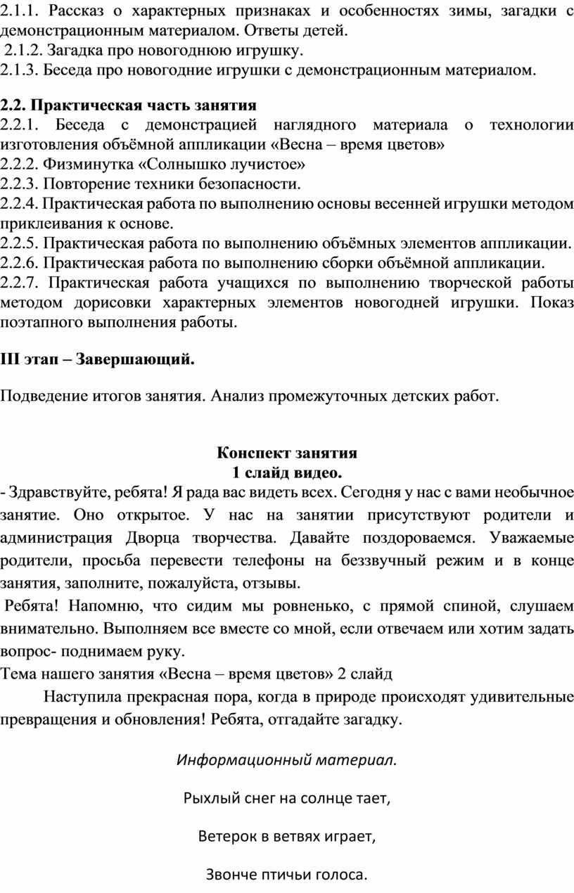 2.2.1. Беседа с демонстрацией наглядного материала о технологии изготовления объёмной аппликации «Весна – время цветов»