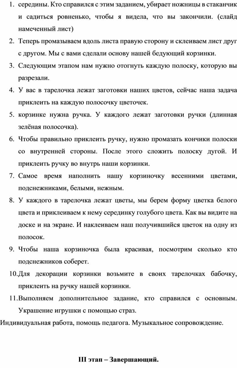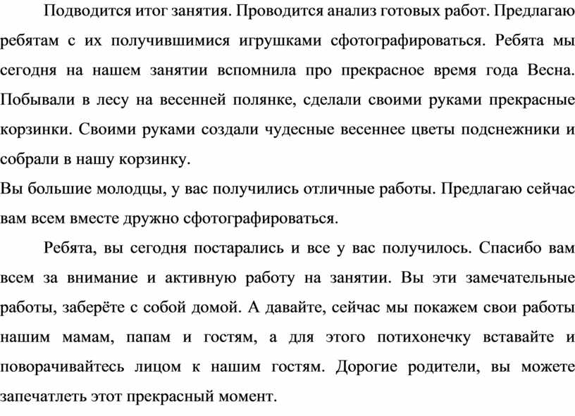 Подводится итог занятия. Проводится анализ готовых работ. Предлагаю ребятам с их получившимися игрушками сфотографироваться. Ребята мы сегодня на нашем занятии вспомнила про прекрасное время года Весна. Побывали в лесу на весенней полянке, сделали своими руками прекрасные корзинки. Своими руками создали чудесные весеннее цветы подснежники и собрали в нашу корзинку.