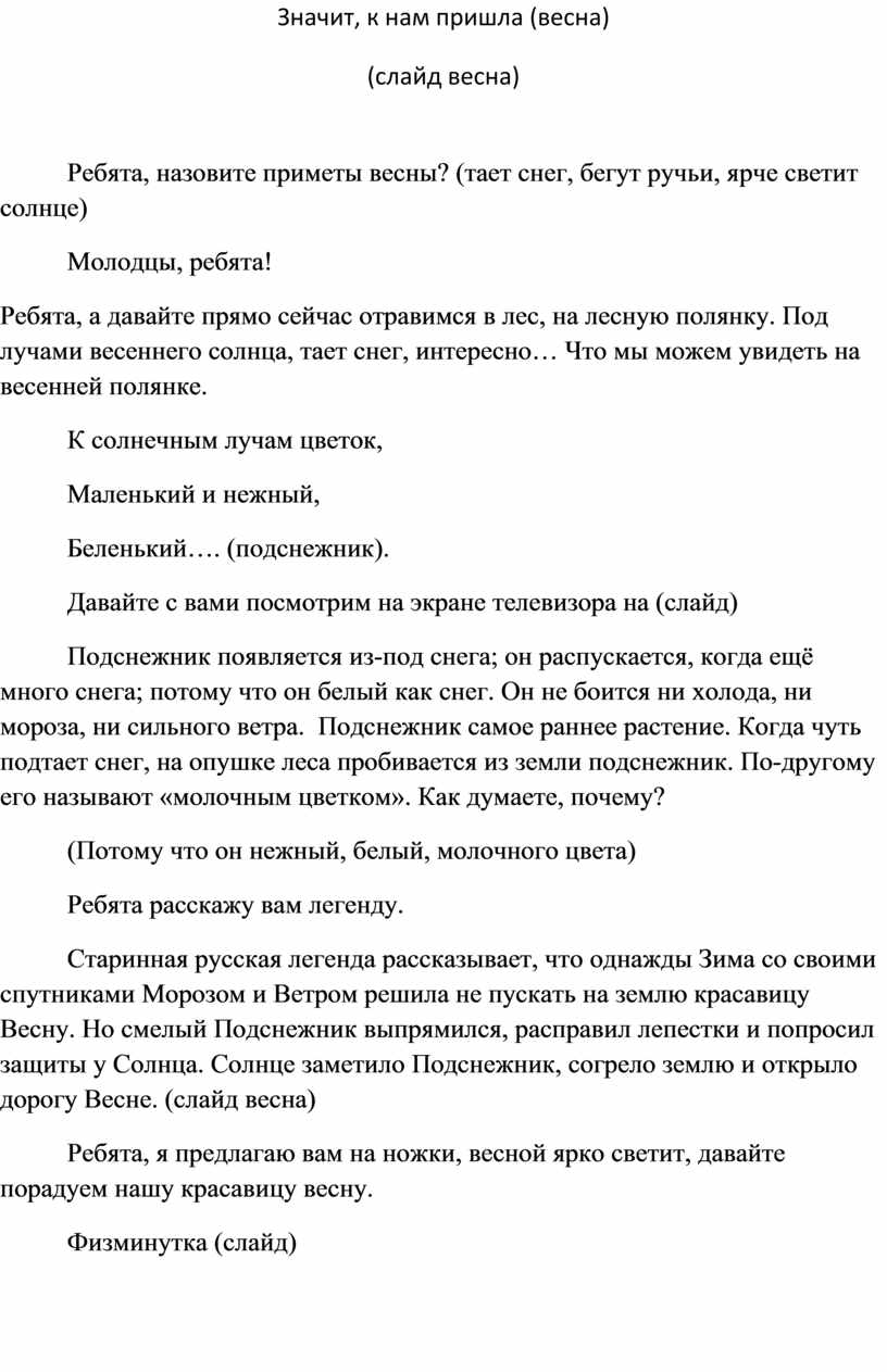 Старинная русская легенда рассказывает, что однажды Зима со своими спутниками Морозом и Ветром решила не пускать на землю красавицу Весну. Но смелый Подснежник выпрямился, расправил лепестки и попросил защиты у Солнца. Солнце заметило Подснежник, согрело землю и открыло дорогу Весне. (слайд весна)
